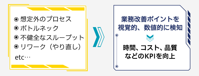 - プロセスマイニングにより、ビジネスプロセスの問題点が明確化され、改善の方針が明確化される。
