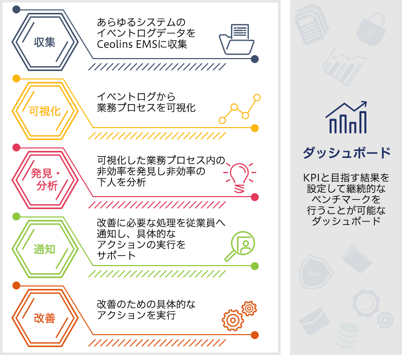 プロセスマイニングを活用することで、業務システムからイベントログを抽出し、